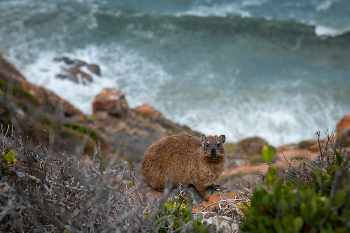 The rock hyrax or dassie is not at all afraid of heigths. Balancing on a rock above the crashing waves is its idea of a relaxing spot. Dassies live in groups of up to 80 animals. Their teeth show a pair of elongated upper incisors, which they have in common with their close relative, the elephant.