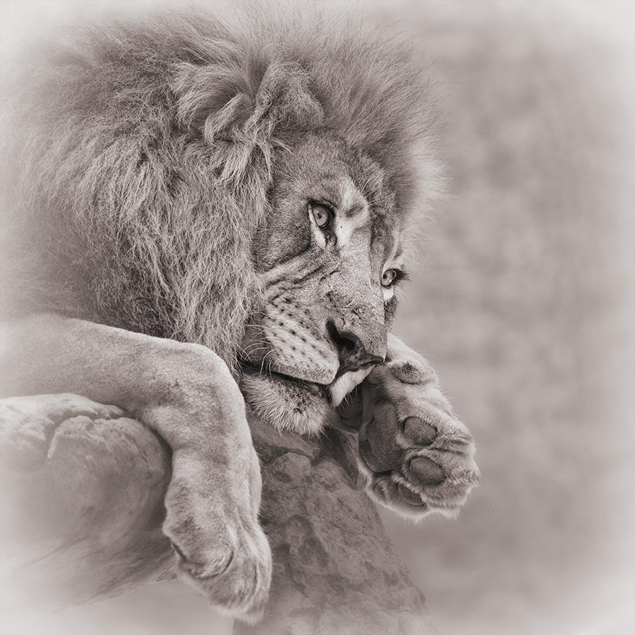 A male lion resting on a rock, staring off in the distance. What does he dream of? And look at those beautiful paws!