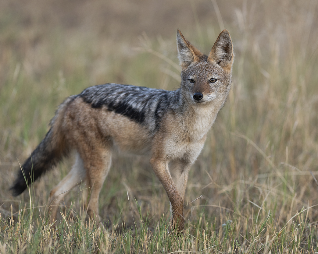 A black-backed jackal hunting early in the morning in Pilanesberg National Park.
