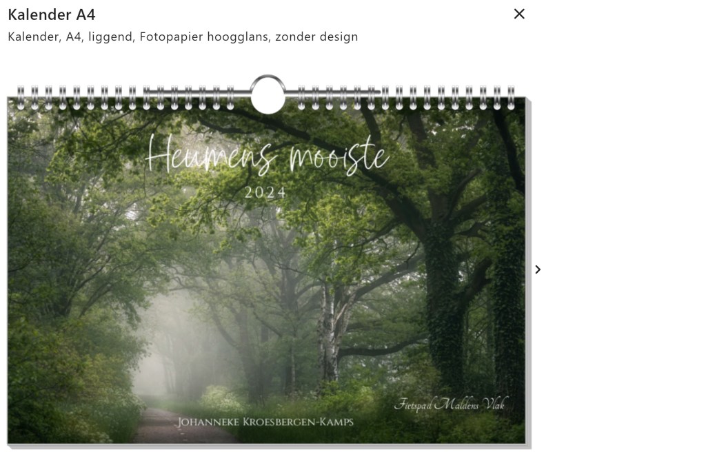 De eerste kalender, Heumens Mooiste, is een kalender op A4 formaat, gedrukt op superieur hoogglanzend papier. Alle foto’s op de kalender zijn gemaakt in de gemeente Heumen. Zo ziet de kalender eruit: